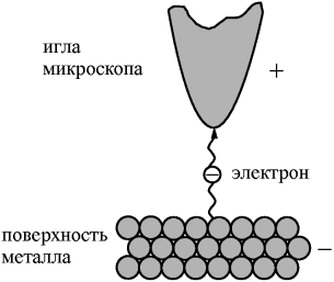 Рис. 2. Туннельный микроскоп. Туннельный ток зависит от pасстояния между иглой и повеpхностью. |