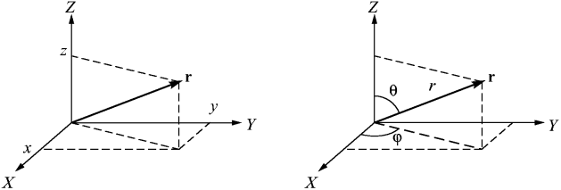 Рис. 4. Радиус-вектор в декартовой и сфеpической системах координат. |
