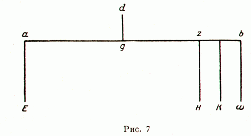 Пусть на одном из плеч весов (рис. 7) подвешены в точках z и b два груза Н и w, уравновешиваемые на другом плече грузом Е, подвешенным в точке а. Требуется доказать, что при замене грузов Н и w грузом К, равным их сумме (К=Н+w) и подвешенным в середине между z и b, равновесие не нарушится. Для доказательства этого положения автор трактата рассуждает следующим образом. Каждый из двух грузов Н и w, уравновешивающих вместе груз Е, уравновешивает в отдельности некоторую его часть. Примем, что w уравновешивает xЕ, а Н уравновешивает уЕ, тогда из установленного ранее закона рычага величины хЕ и уЕ определяются из уравнений. Но Н и w по условиям равны. Если теперь сложить первое и третье уравнения, то получится целое Е. В приведенном выше доказательстве мы встречаемся с методом, резко отличным от античного вообще и от архимедова в частности. Вместо наглядных геометрических построений мы видим здесь алгебраический способ сложения уравнений, способ более абстрактный и совсем иначе подходящий к объекту. Подход этот не обогатил механику новыми выводами, но открыл широкий путь для такого обогащения. При этом как ни объяснять появление в арабской науке алгебраического подхода к различным и в том числе механическим задачам, он должен быть отмечен. Вернемся к § 4 трактата Бен-Курры. Положение, доказанное для двух грузов, распространяется на любое число их. На этом основывается доказательство второго положения, которое гласит: если груз распределен равномерно и беспрерывно по плечу весов или, иными словами, является самим физическим плечом, то он может быть заменен весом, равным по величине и приложенным в середине плеча. Теорема эта доказывается способом довольно сложным, но изящным. Мы приведем только основные его черты. На большом плече bg (рис. 8) весов аb подвешен весомый стержень dbew, распределенный равномерно и беспрерывно по этому плечу. Требуется доказать, что если подвешенный в а груз z уравновешивает груз dbew, то равновесие не нарушится при замене последнего равным ему грузом Т, подвешенным в его середине, т. е. в точке n. Действительно, предположим, что равновесие нарушится и что весы наклонятся в сторону а; тогда для восстановления равновесия необходимо добавить в n некоторый вес L; отметим на аb точку т, расстояние которой от b будет так относиться ко всей длине стержня dbeui, как вес добавленного груза L к весу всего стержня Т. Или, иначе, отрежем на стержне dbew кусок bmhe, по весу равный L. Разделим затем bn и равное ему nd на целое число частей меньших bт. Получим точки и равные куски стержня. Если, мы теперь возьмем кусок adwr, снимем его со стержня и подвесим в точке ?, то он будет уравновешивать большую, чем раньше, часть z, так как плечо рычага стало большим. То же проделаем со всеми остальными равными кусками. Если теперь мы сложим все новые веса, приложенные к левому плечу рычага, то получим на этом левом плече общий вес больший, чем вес z, приложенный к точке а. Если же мы, кроме того, в точке d подвесим еще один такой же кусок (равный ?dwr), то разница в весах на плечах окажется еще большей. По ранее доказанному предложению мы знаем, что равные и подвешенные на равных расстояниях веса могут быть заменены их суммой, подвешенной в середине между точками подвеса двух средних — т. е. подвешенным в точке n весом Т + ?sdw, причем ?dwr, по условию меньше dmhe, каковое равно L. Из этого же сл