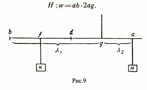 Следовательно, если грузы d и b (рис. 6) подвешены па плечах равной длины, то проходимые ими при наклоне весов расстояния равны, следовательно равны приложенные к ним силы. Если же отодвинуть груз d в положение а и опять поворачивать весы, то окажется, что груз, приложенный в а, будет, находясь на более длинном плече, проходить более длинный путь. Иными словами, он будет находиться под действием большей силы, для уравновешивания которой нужно увеличить силу, приложенную к а, причем увеличить ее так, чтобы отношение новой силы к старой равнялось отношению меньшего плеча к большему, что и дает закон рычага. Вряд ли прав Бухнер; считающий, что, выводя доказательства своего третьего параграфа из положений, высказанных в первом и во втором, Табит делает грубую ошибку, разумея в первом параграфе под понятием "силы движения" величину gv (произведение веса на скорость), а в третьем - Pw (произведение веса на расстояние). При равных промежутках времени (а концы весов проходят свои пути в одно и то же время) Табит имел право заменить скорости пропорциональными им расстояниями. Ошибка его заключается в подмеченной Бухнером нечеткости применяемого им понятия силы или, вернее, в самом факте базирования на неверной, по крайней мере, для данного случая, формуле Аристотеля. Но доказательством закона рычага не заканчивается "Книга Карастуна"; наоборот, это доказательство дано весьма кратко и служит только первой ступенью. За ним следует несколько положений, опирающихся, очевидно, не на первый из рассмотренных нами и приписываемых Евклиду отрывков, а на второй. Цель этих положений, в дальнейшем изложении не используемых, показать, что равновесие на весах не зависит от длины подвесов груза и сохраняется при наклоне этих подвесов под одинаковым углом. Мимоходом здесь высказывается, что при подвесах, направленных к плечам не под 90°, за точки подвеса груза должны приниматься точки пересечения перпендикуляров, опущенных из точек реальных подвесов на плечи весов, с этими плечами. Это также, как мы уже видели у Герона (см. стр. 70), но несколько с другой стороны, подводит к понятию момента сил. Доказательство, даваемое этому положению, базируется опять- таки на выведенной из перипатетической формулы пропорциональности сил и проходимых под их действием в равное время равными весами расстояний. В одной из сохранившихся рукописей за этим следует отсутствующее в других рукописях краткое и совершенно бездоказательное рассмотрение римских весов и способа определения на них, во-первых, общего веса груза, подвешенного на меньшем плече, при известной величине скользящего груза, а во-вторых — определения чистого веса взвешиваемого груза без веса чашки, на которую он кладется. Из содержания, так же как из соответствующих разделов "Проблем механики" и "Механики" Герона, совершенно ясно, что самое деление длинного плеча, его градуировка, производится чисто эмпирически. После этого, несколько гетерогенного отрывка, явно вставленного одним из переписчиков-комментаторов, продолжается главная линия изложения трактата, основным и, пожалуй, наиболее интересным звеном какового является четвертый параграф, распадающийся на две теоремы. Первая доказывает, что два равных груза, расположенных на одном из плеч весов и уравновешиваемых определенным грузом на другом плече, могут бы