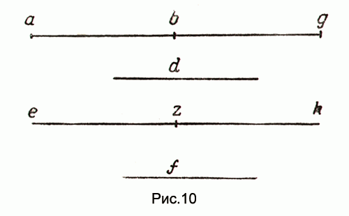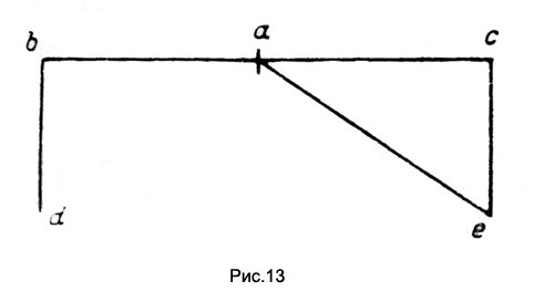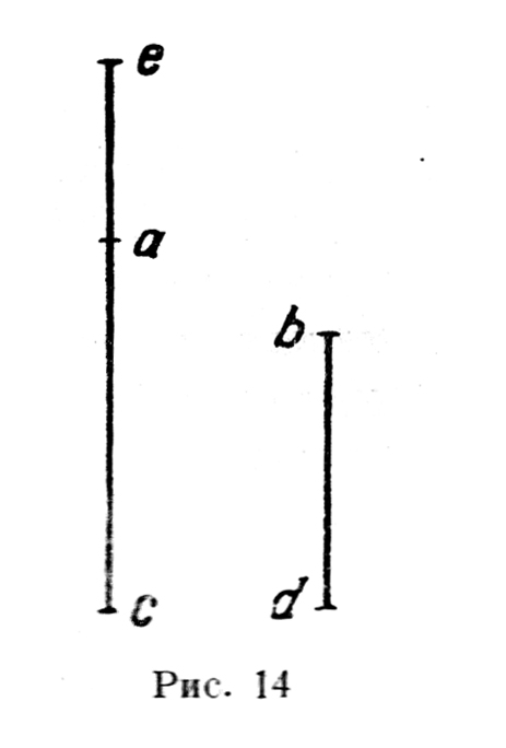 Доказательство этого положения, в котором "implicite" заложено все дальнейшее, о чем, как мы увидим ниже, догадывается и сам автор, ведется следующим образом. Пусть вес а (рис. 14) опускается из а в с, а вес b — из b в d. Требуется доказать, что a/b=ac/bd. Допустим, что наше предположение неправильно. Допустим также, что а больше b на е и ас больше bd на f, (подробнейшее доказательство этого с обильными ссылками на Евклида и Архимеда дается в конце теоремы особо). А так как f есть опускание е, то полученное нами неравенство противоречит нашему предположению, что отношение весов меньше отношения опусканий, а, следовательно, предположение это было сделано неправильно. Таким же образом приводится к абсурду и противоположное предположение и доказывается первая часть теоремы, из которой как следствие выводится и вторая часть, ибо ясно, что подъем равен и противоположен опусканию, а, следовательно, отношение между весами подымающихся и опускающихся грузов обратно пропорционально скоростям их опускания или же проходимым ими путям, так как, подобно большинству разобранных нами выше источников, наш трактат не делает различия между скоростями и длинами путей, проходимых в одно и то же время.