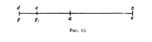 будет иметь силы" Так (рис. 15), если мы будем рассматривать весы bacd и подвесим на левом плече один и тот же вес g сначала в с, а затем в d, то хотя эти грузы естественно (от природы) равны, но один будет опускаться по дуге окружности радиуса da, а другой по дуге окружности радиуса са, а так как длины дуг относятся как радиусы окружностей, то вес груза g, подвешенного в положении d, будет относиться к весу того же груза, подвешенного в положении с, как da к са, а, следовательно, равные грузы будут весить разно в разных местах весов. Кроме того, g, будучи помещен в с, будет уравновешиваться некоторым грузом b на другом конце весов, а будучи помещен в d — некоторым другим грузом c, отношение которого к первому будет также равно отношению са к da; следовательно, разные грузы в одном месте будут уравновешивать равные в разных местах. Из этого вытекает, что веса в данном доказательстве и в дальнейшем изложении должны рассматриваться не сами по себе, а в связи с длинами плеч, на которых они укреплены, так что если мы правильно разберемся в этой связи, то поймем все дальнейшее: "Sic igitur intelligendo conclusionem procedit propositio autoris, aliter non". |