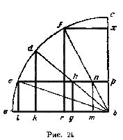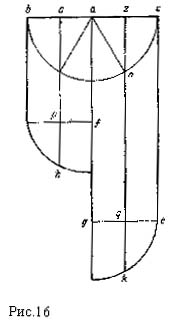 Третья теорема, как мы видели выше, гласит, что различие в длине подвесов не влияет на равновесие весов; теорема эта не доказывалась, а просто как бы разъяснялась в перипатетическом варианте; здесь же доказательство ее достаточно сложно и пространно. Пусть, гласит доказательство, дан (рис. 16) стержень abc, центр которого а, и из двух подвесов bd и се первый короче второго, на концах же их укреплены равные грузы d и е. Пусть afq будет вертикальная линия, проведенная через середину а стержня abc, a df и ge — линии, параллельные abc и соединяющие концы подвесов с названной вертикалью. Из точек f и q как из центров мы проводим четверти окружностей радиуса df = qe, каковое равенство подробно доказывается сведением к 34-й теореме первой книги Евклида (per tricesimam quartam primi Euclidis). Из этого же равенства следует, что и самые четверти окружностей равны, а из этого — то, что опускается по построенным им дугам, и возвращается к доказательству этого утверждения. Из точки а как из центра проводим половину окружности bтnс и предполагаем, что b будет опускаться до т, а с до n, и от точек т и n (печатный текст в этом месте несколько испорчен) проводим линии mh и nk, параллельные вертикали afg, до пересечения с ранее построенными четвертями окружностей. Затем, путем сложного рассуждения, доказывается, что bо так относится к от, как dp к ph, а так как bо и dp равны, то от и ph тоже равны, а из этого выводится, что bd равно mh, так как ор равно bd. Поэтому, когда b будет в т, d будет в h, и, следовательно, b и d будут всегда находиться в одинаковых точках дуги. То же и таким же образом может быть доказано относительно с и е, а, следовательно, доказано и то положение, которое казалось недостаточно обоснованным. После этого геометрического доказательства, изложенного нами со значительными сокращениями, следует весьма любопытная и уводящая нас совсем в другую сторону, очевидно гетерогенная основному тексту, оговорка, что вышеприведенное доказательство базируется на допущении подвесов, параллельных вертикали; фактически же они направлены в одну точку — центру земли, т. е. не вполне параллельны; но так как подвесы весьма не велики по сравнению с большой величиной расстояния до центра, то непараллельностью этой можно пренебречь. Восьмая, как мы уже говорили — основная, теорема содержит доказательство закона рычага: обратной пропорциональности длины плеч и весов. Доказывается она следующим образом.