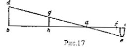 Пусть bас (рис. 17) будет коромыслом весов, на концах которого укреплены грузы b и с, причем b так относится к с, как са к аb. Требуется доказать, что при этом условии весы находятся в равновесии. Предположим, что это не так и что конец коромысла b поднимается в точку d, а конец с опускается в точку е. Опускаем из точек d и е перпендикуляры на прямую bас и по 29-й и 15-й главам первой книги Евклида получаем два подобных треугольника adb и aef, а из этого по четвертой главе шестой книги Евклида da так относится к ае, как db к ef. Но da так относится к ае, как вес с к весу b, следовательно db так относится к fе, как вес с к весу b. На прямой dae отложим затем ag, равное ае, и из g опустим перпендикуляр gh на прямую bас в поместим в h вес, равный весу с. Тогда, так как ga и ае равны, то по четвертой главе шестой книги Евклида gh и fе также равны, а так как веса с и h равны по заданному, то, следовательно, подставляя в предыдущее равенство вместо fe — gh и вместо с — h, получим, что db так относится к gh, как вес h к весу b. Придя к такой пропорции, мы рассуждаем так (arguitur sic): при перемещении bас в dae точки b и h будут двигаться по окружностям диаметров bа и ha=ca, а, следовательно, веса грузов d и g "по положению" будут относиться между собой, как диаметры окружностей их движения, так как b будет описывать большую окружность, чем h. Но мы только что доказали, что отношение естественных весов b и h равно обратному отношению ha к bа, а из сравнения двух этих равенств следует, что грузы b и h, будучи помещены на расстояниях, обратно пропорциональных своим естественным весам, будут на весах равно весить, ибо меньший груз будет "по положению" увеличиваться ровно настолько, насколько он раньше был меньшим. Из этого же следует, что, будучи помещены в указанном положении на коромысле весов, грузы b и h равны по своему действию, и тот вес, который может поднять b, может поднять h. Мы же предположили, что груз с поднимает b, а, следовательно, груз с подымает и h, что невозможно, так как, по условию, с и h равны и расположены на равных расстояниях от d, по второй теореме настоящего трактата. Доказав таким образом то, что требовалось, автор, по-видимому, не удовлетворяется своим рассуждением, начиная с того места, где оно теряет чисто геометрический характер, и предлагает другое, более простое: "aliter potest argumentari secundum communiter loquentes" — отношение веса h к весу b равно отношению подъема b (bd) к подъему h (hg). Следовательно, та сила, которая может поднять b на высоту bd, сможет поднять и h на высоту hg, а, следовательно, первое предположение о том, что с подымает b на высоту bd, — неправильно. Таким же способом, но сокращенно, доказывается и неприемлемость допущения, противоположного первому, — что конец весов опустится, и, таким образом, теорема является доказанной. Это второе, упрощенное доказательство Дюхем считает абсолютно оригинальным и представляющим собой большой прогресс по сравнению с доказательством закона рычага в "Проблемах механики". Закончив это доказательство, автор замечает, что то же самое он говорил уже при введении понятия "gravitas secundum situm" в первой теореме, почему он и пишет, что все указанное выше является прекрасным подтверждением того, что там было сказано, и, наоборот, если действительно глубоко понять то, что там было сказано, то доказательство данной теоремы можно получить и еще более простым путем.