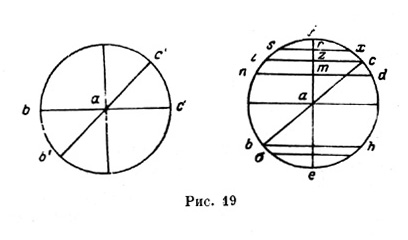 которые приводят Дюхем и другие исследователи Уже самое начало трактата подтверждает принятую нами точку зрения и показывает, что мы имеем дело не с чем иным, как с вариантом трактата "De ponderibus". Начинается он с почти буквальной передачи тех семи аксиом, которые были сформулированы в конце предисловия перипатетического варианта. За аксиомами следуют 33 теоремы, в рукописях разделенные на четыре книги; в печатном тексте это разделение отпало. Первые пять теорем по своим формулировкам почти полностью повторяют формулировки рассмотренных вариантов, только третья теорема поставлена на месте четвертой и наоборот. Затем шестая и седьмая теоремы как неважные выпущены, а они соответствуют восьмой и девятой первых трактатов. Доказательства всех этих семи первых теорем также очень близки к рассмотренным нами доказательствам второго — геометрического — варианта, хотя иногда в них проскальзывают и нотки из доказательства перипатетического, опирающегося на аксиомы, первого варианта. Разумеется, что при наличии аксиом сложные и сбивчивые объяснения понятия "gravitas secundum situm", заключающие первую теорему второго варианта, здесь отсутствуют. Характерно для данного варианта то, что из трех доказательств закона рычага, имевшихся в восьмой теореме второго варианта, седьмая теорема третьего сохраняет только одно второе доказательство — самое простое и основанное на перипатетическом законе приобретаемого движения, а не на законе движения естественного, т. е. доказательство, совершенно не опирающееся на аксиомы, изложенные вначале, и вообще чуждое всему строю изложения первых двух вариантов. Далее, некоторым (и притом с современной точки зрения немаловажным) отличием доказательства третьего варианта от второго является то, что во второй теореме, трактующей о равновесии равных грузов, помещенных на равных плечах, вместо полных дуг от концов весов до вертикали и горизонтали рассматриваются сколь угодно малые частицы этих дуг; возможность такого рассмотрения только мимоходом затрагивалась во втором варианте. Так (рис. 19), если второй вариант рассматривает и сравнивает между собой дуги с´с и b´b, то третий оперирует с дугами cd и b?.