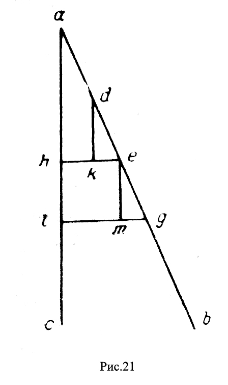 именно поэтому два других варианта доказательства Доказав, как ему кажется, частный случай равновесия коленчатого рычага, автор переходит к более общим случаям. Девятая и десятая теоремы представляют собой подход к общему решению вопроса — они трактуют о связи веса с наклоном, но которому он движется, т. е. стараются доказать то, что, собственно говоря, было постулировано вводными аксиомами. Девятая, чрезвычайно краткая и лаконическая теорема гласит: equalitas declinationis identitatis ponderis, т. е. при равном наклоне пути, по которому движется вес, величина его не изменяется в зависимости от места пути, на котором он находится. Действительно, пусть какой-нибудь груз движется (рис. 21) по наклонной прямой аb и пусть alc будет вертикаль; требуется доказать, что при движении из d в е или из е в g, при de =eg, gravilas secundum situm движущегося груза не изменяется. Опускаем из е и g перпендикуляры на ас, а из d и е перпендикуляры на eh и gl; из равенства прямоугольных треугольников dke и emg выводим равенство сторон dk и ет, а, следовательно, равные отрезки наклонной имеют равные проекции на вертикальной, eaqualiter capiunt de directo, т. е. груз на этих отрезках равно весит secundum situra.