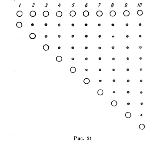 "Для того чтобы на опыте найти пропорцию интервалов падения разных и однообразных весов, пусть будет поставлена вертикально доска тn и пусть она будет покрыта известью (interrata con terra di cimafcura); к этой доске пусть будет присоединена наподобие книги доска ор так, чтобы их можно было мгновенно сложить двумя нитями, как видим (на рисунке), и пусть на верхнем краю доски, покрытой известью, будет укреплен конец черботаны (огнестрельное оружие), поставленной дулом вниз (stoppata da pie), полный шариками разного веса и формы. Затем укрепи хорошо черботану и покрытую известью доску и открой черботану; когда увидишь, что первый шарик дошел до половины покрытой известью доски, тотчас же дай упасть противовесу; обе доски закроются, и шарики, которые падали, скользя по извести, все воткнутся в известь, и ты затем сможешь измерить отношение разностей их расстояний. "Если хочешь проделать этот опыт, то черботана не годится, так как тот шарик, который будет последним в черботане, будет падать с большей высоты, чем первый, почему его движение будет более быстрым. "Этот же способ хорош для того, чтобы на опыте проверить падение двух движимых тел, из которых одно вдвое тяжелее другого, и ты увидишь, действительно ли падение более легкого проделает половину пути, когда более тяжелое коснется земли". Опыт, предлагаемый Леонардо, чрезвычайно ясен и прост, хотя и страдает дефектом, который, как видно из предпоследнего абзаца приведенного отрывка, был тут же замечен и автором: шарики, помещенные в дуле один за другим, будут при своем падении проделывать еще в самом дуле движения разной длины, почему интервалы между ними окажутся не вполне сравнимыми. Мы не знаем, применял ли на практике Леонардо свою установку. Если он ее применял, придумав какое-нибудь приспособление для задержки очередного шарика перед его выпуском из дула, т. е. приспособление, дававшее возможность выпускать шарики действительно с одной высоты и тем уничтожить замеченный им самим дефект, то эксперимент его должен был показать, что шарики, выпускаемые через равные промежутки времени, сохраняют равные расстояния. По всей вероятности, однако, установка в том или другом виде применялась, так как в другой записи "Атлантического кодекса., (С. А. 147 r. а.) мы находим указание на то, что закон ускоренного падения выведен именно при помощи какой-то установки, близкой по типу к описанной выше. Текст этот будет приведен нами несколько дальше. Но если мы можем только догадываться о том, каким образом Леонардо пришел к своим формулировкам закона ускорения свободно падающего тела, то самые эти формулировки нам известны достаточно хорошо. Наиболее полная из таких формулировок, занесенная в кодексе "М", звучит так (44 v.): "Случается в воздухе равномерной плотности. Опускающаяся тяжесть в каждой степени времени приобретает на одну степень движения больше, чем прошлая степень движения, почему в каждом удвоенном количестве (quantita) времени удваиваются длина и скорость движения. "Здесь показывается, что то же отношение, в котором находится одно количество времени с другим, будет существовать и между одним количеством скорости с другим" (рис. 31).