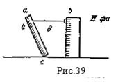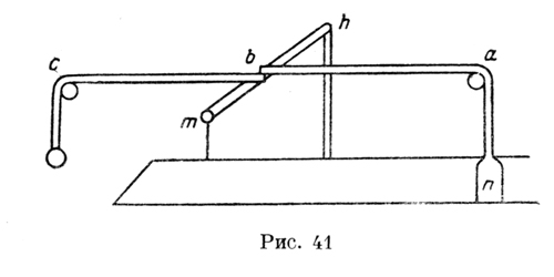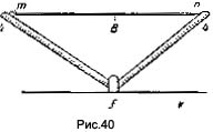 "О тяжести. Всякая нить, поддерживающая любой вес, испытывает вес вдвое больший того, который может быть подвешен на ней. Доказывается это так: пусть во второй фигуре (рис. 39) нить аb поддерживает конец балки ас в точке а, причем тяжесть этой балки 4. Я утверждаю, что 4 веса в воздухе требуют 4 силы (р) и 4 другого веса, который бы ему сопротивлялся в b. Но теперь мы дадим ему 4 единицы силы, называемой реальной силой (4 di potenzia detta forza) или приобретаемым весом в b, которые будут сопротивляться опусканий этой балки.