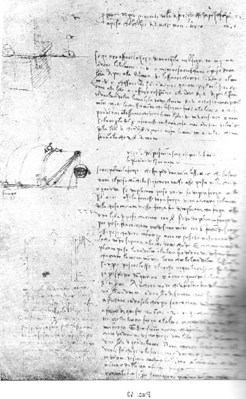 себе "Сила есть причина движения, движение есть причина силы. Движение вливает силу и удар в вес при помощи своего объекта. "Сила при некоторых своих действиях, когда разрушается, переносится на то тело, которое бежит впереди, и рождает при помощи движения удар большего эффекта, и после себя оставляет разрушение, как это видно в движении ядра, гонимого силой бомбарды. "Сила распространяется только на 3 дела, которые содержат бесконечное множество дел. Эти 3 дела суть: тащение, толкание и останавливание. Рождаться же сила может из двух разных движений. Первое будет при внезапном увеличении редкого тела в плотном, как увеличение огня в бомбарде, каковой не находя в пустоте восприемника своему росту, с яростью бежит к более обширному помещению, изгоняя всякое препятствие, противостоящее его стремлению, и то же самое делает течение воды и ветра, которые гонят всякое противодействующее им препятствие. "Второе же есть то, которое создается в телах согнутых в скрученных (и выведенных таким образом) из своего природного состояния, как самострел или другие подобные машины (machine), которые неохотно дают себя согнуть, а после того, как они нагружены, стремятся распрямиться, так что, как только им предоставляется свобода, они гонят с силой ту вещь, которая сопротивляется их бегу. "Удар рождается при смерти движения и движение, — при смерти силы" (А. 34 v.). Эта длинная, сравнительно ранняя запись обнаруживает бросающуюся в глаза близость с уже приведенными выше высказываниями Леона Баттисты Альберти, еще в большей степени, чем леонардова характеристика веса. Тот же эмоционально-описательный подход к сюжету, который не может быть охвачен сухой сетью строго научных определений, тот же антропоморфизм, который затем перейдет в писания натурфилософов XVI в., и, наконец, внешняя, но весьма характерная мелочь — различение трех видов движения под действием силы: тащения, толкания и ношения — у Альберти; тащения, толкания и останавливания — у Леонардо.