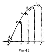 На установлении изменения скорости брошенного в воздух тела, т. е. в первую очередь скорости артиллерийского снаряда, Леонардо останавливается сравнительно часто, хотя исключительно в ранних записях. Тема эта является традиционной в схоластической механике. Естественно поэтому, что разработка ее как бы подворачивалась под руки исследователю, с одной стороны практически занимавшемуся артиллерийскими вопросами, а с другой — страстно изучавшему писания механиков-схоластов. Но кроме этой традиционной темы перед исследователем ставилась жизнью и другая тема: значительно менее традиционная, но жизненно более важная — тема траектории снаряда. В относящейся к позднему времени тетради "M" Леонардо записывает: "Я хочу знать, насколько ружье (passavolante о scopietto) выбрасывает вверх одно больше, чем другое, и чтобы сделать это, я посажу мое оружие (strumento) по линии bс (рис. 45) неподвижным образом так, чтобы оно не изменяло своего наклона, и, сделав это, я ему дам так мало пороха, что оно выбросит ядро на 2 локтя от ружья, т. е. есть sb, и замечу, где упало ядро в n, затем удвою порох и посмотрю, где оно упадет в т, и если я найду, что основание те будет вдвое больше основания nс, я буду знать, что высота пирамиды (della piramide) hc будет вдвое больше, чем sc. "Существует то же отношение между основанием и основанием, которое имеют сторона со стороной и высота с высотой. "Ты применишь правило третьей и скажешь: если высота пирамиды, которая, как я уверен, есть sc, дает мне локоть основания или же один локоть основания образуется 10 локтями пирамиды, то откуда произойдет 65 локтей другого основания?"Здесь рождается одно исключение, а именно: если первое ядро пошло на 100 локтей вверх при помощи одной унции пороха, то оно прошло через воздух большей толщины (grosezza — плотности?), чем то, которое поднялось на 3000 локтей, почему, так как то, которое проходит названные 3000 локтей, проходит каждые 100 локтей через воздух более тонкий, чем первое, то оно постоянно приобретает большую скорость" (М. 53 r.). Запись эта, сравнительно одинокая в наследии Леонардо, констатирует, что при равном угле с линией горизонта для увеличения дальности полета надо увеличивать высоту его, причем одна прямо пропорциональна другой; это неправильно, если мы будем рассматривать современную формулу, определяющую соотношение между высотой и дальностью полета снаряда,1 но правильно, если мы, подобно Леонардо, будем рассматривать линию полета снаряда, как геометрическую сумму двух прямых — наклонной приобретаемого движения и вертикальной Движения естественного, соединенных дугой, и будем разлагать первую наклонную прямую на две составляющие — вертикальную и горизонтальную, что фактически (не оговаривая этого) делает Леонардо. Независимо, однако, от правильности приведенного выше рассуждения, оно замечательно тем, что в нем впервые ставится в научной форме вопрос о высоте и дальности полета снаряда. Вопрос этот был остро актуален в XV в веке бурного и неудержимого расцвета артиллерии, в своем росте искавшей опоры в математической теории, но не находившей ее потому, что вопрос этот не входил в число проблем, разбиравшихся схоластической механикой. Даже для постановки, не говоря уже о разрешении, этот вопрос требовал оригинальности, уменья по-новому поставить вопрос, чем всегда отличался Леонардо.Однако, подойдя к ра