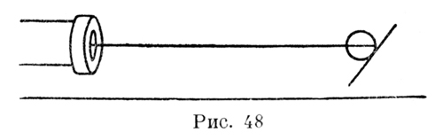 "Тот удар, который будет произведен по объекту под более неравными углами, будет более слабым и при отскоке от этого удара он кончится быстрым отскоком с двумя разными движениями (рис. 48). "Такой удар будет приносить малый вред ударенному месту, ибо остающееся количество веса от центра удара вверх настолько больше количества, расположенного от центра вниз, что после удара он (удар) качается, как весы под действием неравных грузов, и это качание является причиной двух разных движений в шаре, из которых одно имеет значительно большую скорость, чем другое. Первое будет законным и упорядоченным движением, второе же, двигаясь по прямой, будет вращаться вокруг самого себя, каковое вращение создает значительно более быстрое и более длинное движение, чем движение прямое и обычное" (А. 44 v.). Подобных или близких по характеру записей имеется в ранних тетрадях сравнительно много. Все они, как только что приведенная, свидетельствуют о пристальном внимании к проблеме удара с точки зрения интересов артиллерии и о значительной еще беспомощности и наивности в работе над этой проблемой. Все теоретизирование сводится в них обыкновенно к более или менее удачному описанию протекания того или иного случая удара и к констатации того, что наиболее сильным является удар, "производимый под прямыми углами", т. е. удар, нормальный к плоскости.