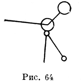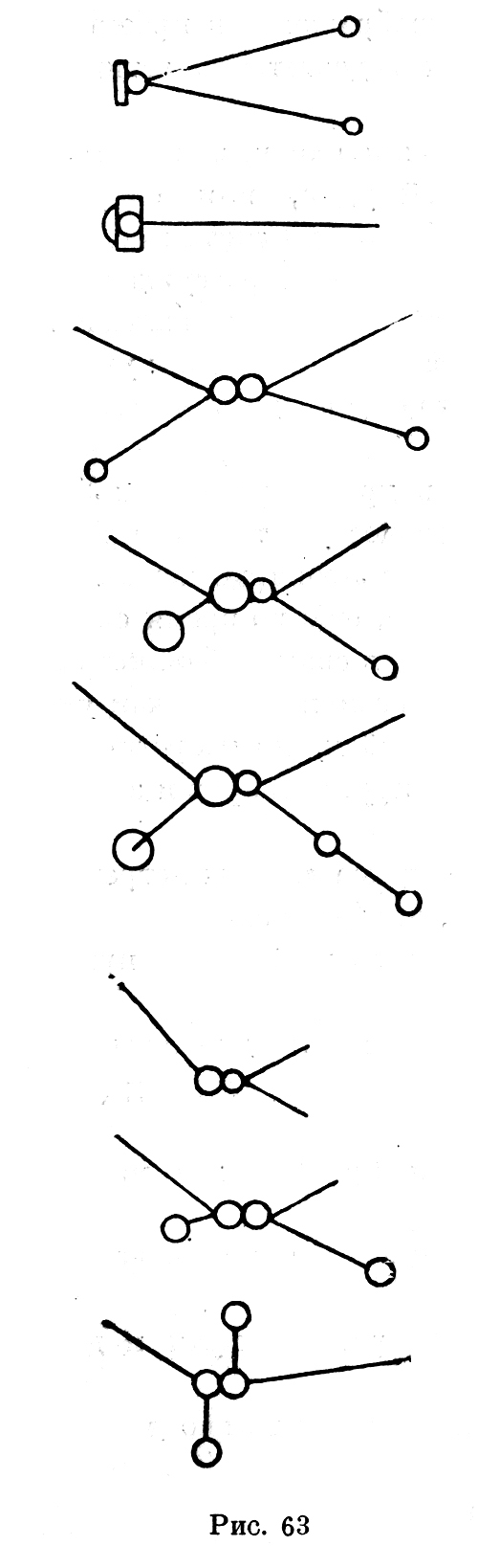 Из рисунка и записи ясно, что именно разложение на две составляющие силы, образующей удар, или скорости движения, ведущего к этому удару, Леонардо считал основой своего учения об ударе. Несмотря на все ошибки в рассуждениях, это делает их заслуживающими самого серьезного внимания, которого они, кстати сказать, до сего времени не имели: учение Леонардо об ударе ни разу не служило еще предметом исследования. Не столь, хотя все же достаточно подробно разбирает Леонардо и удар двух движущихся сферических тел. Вопросом удара друг о друга двух упругих шаров Леонардо начал, по-видимому, интересоваться довольно рано, еще во время своего первого пребывания в Милане. Очевидно, в связи с баллистическими занятиями, он, разбирая разные возможные случаи удара, наталкивается на редко встречающийся, но теоретически весьма интересный случай удара двух упругих шаров и заинтересовывается им. Действительно, в ранней записи кодекса "А" мы встречаем уже следующее описание или, вернее, изображение различных случаев удара, которое ввиду его сравнительной длины приводим не полностью: "Если объект (удара) и ударяющий предмет тверды, то, согласно правилам удара, (последний) отскакивает назад (рис. 63). "Двигающееся тело погружается и проникает в мягкий объект. "Равенство движения, веса, удара вызывает одинаковое отскакивание тел. "Удар двух тел неравного веса, но равного пути и движения. "Путь, проходимый большим весом, значительно меньше пути меньшего веса. "Больший путь — большего веса.