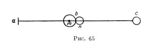 "Если два шара (рис. 64) сталкиваются под прямым углом, то один тем больше отойдет от начатого им пути по сравнению с другим, чем один шар будет меньше другого" (С. 15 r.). Или: "с (рис. 65) отскакивает вдвое больше при ударе b, когда т не отскакивает, так как удар происходит в объект более чем устойчивого удара."При ударе, производимом движимыми телами, равными по весу, но не равными по движению, более быстрое не отскочит. И это доказывают нам игроки в "паллу", у которых рука, ударяющая в мяч, более быстра и более сильна вследствие своей тяжести, чем этот мяч, почему она заставляет этот мяч отскакивать назад с тем большей силой, чем ближе линия удара к линиям центра их движений" (С. А. 93 v. b.). В последней записи, хотя и не относящейся в части примера к удару шаров, любопытно то, что в ней ясно обнаруживается обычный для Леонардо метод теоретизирования на материале наблюдения простых, обыденных фактов — в данном случае любимой в аристократических кругах игры в "паллу" (предок вашего тенниса). Теоретивирование это, как мы отмечали выше, представляет собой первую стадию научной работы Леонардо переходящего затем к сознательно поставленному эксперименту. Окончательно сформулированы два частных случая удара шаров в следующей записи: "Если два шарика брошены по прямой навстречу друг другу так, что один ударится о другой, и если они имеют равную силу (р), ярость (vementia) и вес, то тотчас же, как они встретятся они оба остановятся разряженными (disfalte). "Если 2 шарика брошены вверх так, что они встретятся то движение правого перейдет в движение левого и таким же образом движение левого заменится движением правого"(А.32 r.). Очень вероятно, однако, что все приведенные записи об ударе шаров относятся еще к первой стадии работы Леонардо или к самому началу второй. Сколько-нибудь окончательного оформления работы, Леонардо на эту тему, по-видимому, не получили. Итак, мы можем свести высказывания