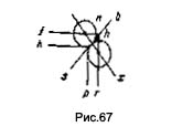 "Удар. Угол, производимый при столкновении равных сферических тел, всегда равен углу отражения" (С. 28 r.)(рис. 67). Обращает на себя внимание то обстоятельство, что в чертеже сопровождающем последнюю запись, мы опять встречаемся разложением скорости или силы движущихся тел на две взаимно перпендикулярные составляющие — направленную по линии удара и нормальную к ней. В другом месте Леонардо пишет: