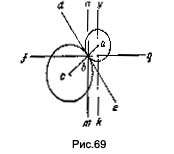 "Доказывается это так (рис. 69): пусть направление двух противоположных движений будет nт, а место удара обоих сферических тел будет b; тогда обнаруживается, что сила удара в два раза больше, чем меньшая часть ударенного шара, так как всякое уравновешение веса (librazione) удара должно происходить под равными углами (между линиями действия) двух сил, как доказывается в книге о весе". Здесь имеет место как будто бы не вполне ясная и, возможно, незаконченная аргументация, так как она не использует значительной части вспомогательных линий чертежа. Очевидно, она клонится к тому, чтобы доказать то правильное положение, что всякий удар шаров будет центральным. Дальше та же запись продолжает следующим образом: "Ударяющее тело ударяет объект с тем меньшей силой (р), чем более способным к бегству оно его находит. Но то ударяющее ударяет объект с тем более интенсивным ударом, которое встречает более устойчивый объект. "Наибольший же удар бывает при наибольших скоростях плотных тел, когда они равны друг другу. "То ударяющее тело с менее сильным движением отскочит на меньшее расстояние от места удара, которое будет ударять частью, более близкой к центральной линии его. Доказывает это тем, что та часть движимого, которая направлена к центру ударяющего, стремится вернуться назад и сопровождать движение ударяющего тела; часть же, расположенная вне центра которая не испытывает сопротивления, стремится продолжать начатое движение, почему по необходимости такое движение приобретает вращение вокруг центра своей тяжести, и если разница между их силами будет неравная (fia inequale), то более сильная часть будет немного двигать тело с собой до тех пор пока не уничтожит остатка своего импето. "Но часть тела, находящаяся вне (in la) места удара, которая не испытывает воздействия силы ударяющего тела, не встречалась с ним и не противостояла его движению, стремится продолжать свое движение в свободном воздухе. А так как она соединена с частью, возвращающейся назад, то тело по необходимости выбирает неотраженное и не падающее движение, но, будучи так составлено, оно образовывает движение тройного состава, причем одна часть — отраженное движение, другая — падающее, третье же, уничтожающее эти стремления, будет движением прямым (motto retto), которое будет движением отличным от каждого из двух первых, прежде чем они ударятся, и отличным от тех, которые рождаются после удара, причем движение это будет прямым и поперечным (traversalc)" (С. А. 241 r.). В другом листе того же "Атлантического кодекса" мы находим другую запись, относящуюся к удару шаров, — запись неоконченную и недоделанную, но интересную широкой постановкой в ней вопроса: "Об ударе движимых разных скоростей. Движимые разных сил (p) бывают двух родов, из которых один — когда движимые имеют равный вес и скорость, другой — когда они имеют разные веса и разные скорости, третий — когда либо они имеют равные веса и неравные скорости, либо разные веса и равные скорости, либо они имеют разные веса и разных скорости... "Если ты ударишь приближающийся шар (l´avvenimento ´della palla) по центральной линии его движения, то он, без сомнения, возвратится назад потому же пути, по которому он шел, но если ты ударишь его в меньшую часть, он не обернется назад и не будет итти вперед, но склонится в поперечном движении (moto traversale), причем импето его уменьшится настоль