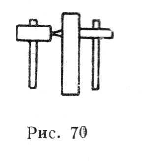 от самой этой прямой (С. А. 241 г.) Несколько выпадает из круга только что рассмотренных нами понятий и представлений приведенный выше отрывок (С. 28 г.). В нем Леонардо, в противоположность всем последующим отрывкам, говорит, очевидно, об ударе неупругих шаров которые действительно при столкновении не расходятся. То же, что он совершенно не упоминает о принципиальном отличии данного типа удара, объясняется, по-видимому, тем, что данная запись является вырванной из какого-то, очевидно более общего контекста, для которого она предназначалась. Таким образом, и в вопросе о непрямом ударе упругих шаров, стоя на твердой экспериментальной базе, фиксируя, без особых мудрствований, результаты своих опытов и наблюдений, Леонардо приходит в общем к правильным результатам. Начиная же подыскивать "научные" объяснения того или иного установленного им феномена, он идет по пути искусственных, по большей части заимствованных из арсенала схоластики аргументов и соображении. Но и здесь, пытаясь наиболее органично сочетать абстрактную теорию и реальную практику, он нередко вплотную подходит к очень важным и ценным утверждениям, которые, однако, не могут отрешиться от бесплотной атмосферы схоластической теории и поэтому никогда не доводятся им до сколько-нибудь окончательной разработки. Так и в данном, например, случае разложения скоростей или движений ударяющихся тел на взаимно перпендикулярные составляющие Леонардо вплотную подходит к ясному пониманию такого разложения, но, как и в случае с отскоком, путая условно выделяемые составляющие с реальными частями тел, создает на правильной канве фантастический, наивный и мало убедительный рисунок своей аргументации. Наиболее конкретной, эмпирической, необоснованной научно частью рассуждений Леонардо об ударе, несомненно, является их последняя часть, посвященная рассмотрению удара несферических тел. Таков, например, основной случай удара молотка по наковальне, причем рассматривается не поведение ударяющего тела, как в первой группе, разобранной нами выше, а поведение ударяемого тела. Начинает Леонардо, как обычно, записями элементарных наблюдений и опытов в ранних, первого миланского периода тетрадях, например: "Здесь удар производит 3 действия: раньше всего — быстрое соприкосновение, производящее звук; 2° — скорость, заставляющая входить острие гвоздя; 3° — отскок, производимый молотом сзади доски так, что удар раньше заставляет войти внутрь острие гвоздя, чем отскакивает задний молот (рис. 70).