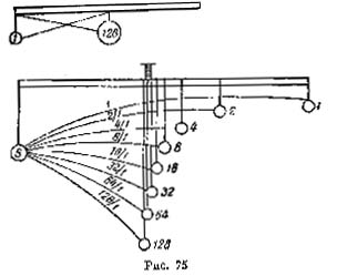 "Необходимо, чтобы единица, находясь на равном расстоянии от другой единицы, уравновешивала ее. "Здесь одно расстояние против двух имеет два веса против одного. "Четыре расстояния против одного требуют одного веса против четырех. "Восемь расстояний против одного требуют одного веса против восьми". Точно так же с поразительными терпением и настойчивостью Леонардо продолжает записи и зарисовки вплоть до 121 делений, заканчивая так: "И если ты должен подвесить 128 весов против одного (рис 75), навесь его на расстояние единицы против 128.