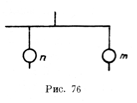 "Всякое весомое тело стремится к середине, и то положение, которое — будет более наклонным, больше сопротивляется ему, и то тело окажется более тяжелым, которое будет иметь более слабое сопротивление, и то сопротивление будет более слабым, которое более удалено от своей точки укрепления. Равные веса окажутся в той же пропорции, как и их сопротивление. Так, m (рис. 76) по весу равно n, и так как его сопротивление вдвое более длинно, чем сопротивление n, то оно также вдвое слабее. Следовательно, т, будучи равно 1, исполняет работу двойную против одного в n, так как его плечо вдвое длиннее, чем плечо n, почему если кто-нибудь поместит в n еще один вес, равный первому, то он будет иметь вдвое больше веса, чем в т, и таким образом весы будут иметь равные силы (р), противоположные вокруг своей точки опоры. "Во всяком весомом теле имеется разная способность (virtu) к естественному движению и к весу, взятым в одном направлении (?). "Равные веса, равноотстоящие от центральной линии точки опоры весов, не выведут плечо этих весов из положения равновесия. "Если к неравным плечам весов подвесить равные веса, то вес, подвешенный на более длинной стороне, будет причиной движения весов. "Если плечи весов будут находиться в той же пропорции, в какой находятся подвешенные к ним веса, и если на более коротком подвешивается более тяжелый, то эти веса будут одинаково тяжелы по положению (secondo il sito). "Равенство наклонности определяет одинаковое бытие весов на плечах весов. При неравенстве наклонности плечи, хотя бы они и были разной длины, сопротивляются друг другу в обратной пропорции к длине и наклонности этих плеч. "Если два веса будут опускаться по двум разным наклонностям и весы и наклонности будут находиться между собой в одной и той же пропорции, то будет найдено, что веса эти имеют при опускании равные скорости. "Если отношение плеч будет соответствовать отношению данных весов и более тяжелый будет висеть на коротком плече, тогда весы останутся в положении равновесия" (Аr. 76 v.) Данная запись, как то, впрочем, нелегко заметить при запутанности и замысловатости ее выражений, представляет собой не что иное, как своеобразно переделанное изложение обоснования закона рычага, даваемое первым и отчасти вторым вариантом трактата Иордана Неморария. Действительно, Леонардо рассуждает, примерно, так: как подробно обосновано в учении о весе и естественном движении, то тело легче, которое подпер то, а менее подперто то тело на весах, которое более удалено от точки опоры; следовательно, тело, расположенное дальше от точки опоры, более тяжело "по положению", чем и доказывается закон рычага. То, казалось бы, голословное утверждение, что менее подперто то тело, которое более удалено от точки опоры, опять-таки обосновывается понятием "gravitas secundum situm". Действительно, тело, более удаленное от точки опоры, опускается по более наклонной кривой, а тело, опускающееся по более наклонной кривой, менее подперто и весит больше. Легко заметить, что кратко приведенное и повторяющееся в ряде других записей обоснование закона рычага Леонардо в смысле строгости и формальной стройности стоит далеко позади своего прототипа — соответствующих доказательств первого и второго вариантов трактата "De ponderibus". Вместо формулировки основного закона естественного движения и понятия "gravitas secundum situm", увеличивающегося