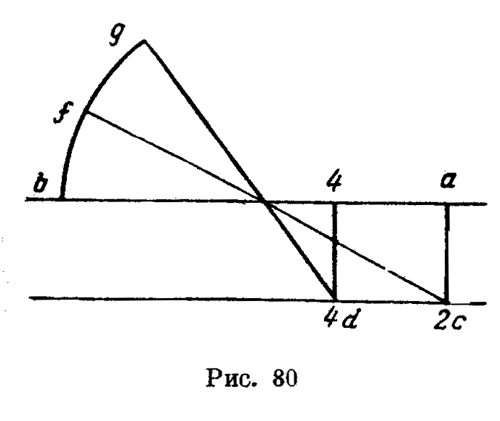 Однако такое рассмотрение весов обычного типа не вполне удовлетворяет Леонардо, и он продолжает: "Этот опыт не годится (questa sperienzia non serve), так как в каждую частицу движения эти весы приобретают частицы медленности". Дальше он разбирает "круговые весы", т. е. систему шкивов равного диаметра, в которых отпадает это возражение, не вполне нам, впрочем, понятное. Другой пример сведения закона рычага к закону приобретаемого движения дает нам следующую запись: "Если а=2 двигает b в f (рис. 80), опускаясь в с, то 4, опускаясь в d, будет двигать b=2 дважды расстояние bf, и, следовательно, оно пойдет в g (Ar. 63 v.).
