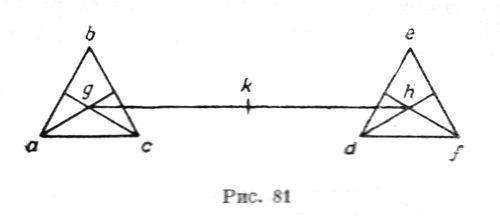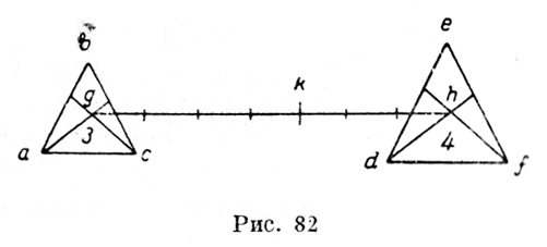 "В каждых двух равных треугольниках центр тяжести наводится в середине линии, выходящей из центра одного треугольника и кончающейся в центре другого треугольника. Пусть мы имеем два треугольника аbс и def (рис. 81). Центр abc пусть будет g, центр def пусть будет h. Теперь проводится линия от центра g в центр h; пусть это будет линия gh, каковую раздели поровну в точке k. Я утверждаю, что если они будут одинаково весить (peseranno), то они будут и одинаково тяжелы (poseranno), будучи равными. Так как линия gh, выходящая из их центров, разделена поровну в точке k, то такое же отношение существует между gk и kh, какое существует между одним треугольником и другим. И, следовательно, k есть центр тяжести двух треугольников, потому что он находится между ними в том же отношении, в каком находятся их расстояния от точки и оси (bilico) их весов g и h, подвешенной к точке опоры k, по первой первого архимедовых "De ponderibus". "Если два неравных треугольника будут одинаково весить на неравных расстояниях, то больший будет находиться на меньшем, а меньший — на большем расстоянии (рис. 82). Ты имеешь два треугольника abc и def. Первый меньше (в оригинале ошибочно сказано — больше), и центр его находится в g, а центр большего (в оригинале — меньшего) треугольника есть h. Теперь проведи линию из g в h и будешь иметь на этой линии центр тяжести двух треугольников в точке k, и на ее концах будут подвешены оба треугольника, отношение между которыми таково, каково оно между противоположными расстояниями, которые они имеют от точки k их оси. Так как треугольник abc есть ? треугольника def и расстояние kh есть ? расстояния gk, и так как эти треугольники не равны, то обратная пропорция, которая существует между ними и их расстояниями от точки опоры рычага, заставляет их быть одинаково тяжелыми (ponderare). Так как расстояние gk равно 4 и расстояние kh равно 3, то и треугольник def равен 4 и треугольник abc равен 3.