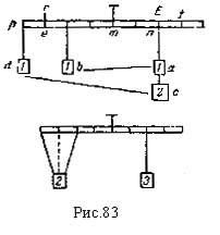 "Равные количества, расположенные на равных расстояниях, будут равно тяжелы, и если равные количества будут одинаково тяжелы, то они расположены на одинаковых расстояниях. И если неравные количества будут равно тяжелы, то они расположены на неравных расстояниях — большее на меньшем расстоянии и меньшее на большем расстоянии. И если равные количества не будут одинаково тяжелы, то они расположены на неравных расстояниях: то, которое более тяжело, находится на меньшем расстоянии. Если два количества на равных расстояниях будут одинаково тяжелы, то и всякие равные количества, расположенные на этих же расстояниях, будут также одинаково тяжелы. И всякое расстояние на плоскости (spazio piano) имеет центр тяжести на своей поверхности между своими концами" (Аr. 16 r. и 16 v.). Не только прямая ссылка на Архимеда, но и весь характер аргументации говорят в этом доказательстве о том, что оно ид до пути, указанному "Равновесием плоских фигур". Но какая разница между четким, классически стройным эллинистическим произведением III в. до н. э. и беспорядочной записью итальянца XV в.! В немногих, по возможности кратких словах, отбрасывая все аксиомы, даже как бы не замечая сложной, ступенчато восходящей, почти безупречно логической цепи математических доказательств, Леонардо стремится передать самую суть аргументации Архимеда, ухватить ее основную черту. Подход Леонардо несколько напоминает нам обращение с архимедовым наследием у Герона, также передающего только суть и не приводящего доказательств великого сиракузца. Но Герон берет у Архимеда в основном только окончательный результат, так сказать, рецептуру; Леонардо же заимствует у него идею обоснования, ибо окончательный результат ему прекрасно и непоколебимо известен из опыта. Приведенная выше запись, как будто бы наиболее полно и в наиболее совершенной форме передающая архимедов вариант леонардова обоснования закона рычага, отнюдь не является одинокой в его тетрадях. Таких записей, пестрых, разно сформулированных и не всегда достаточно ясно выраженных, имеется довольно много. Приведем, для примера, отрывок одной из них: "О центре тяжести (рис. 83). Центр подвешенной тяжести находится на центральной линии поддерживающей ее нити, что доказывается грузами b, d, подвешенными на первых весах, центр тяжести каковых, хотя они будут соединены в одно тело, будет находиться в середине между двумя подвесами на одной линии. Допустить же это нужно потому, что вес а сопротивляется весу b на равных плечах весов, а второй вес с сопротивляется весу d, а так как расстояния, пропорциональные весам, суть nт и те, которые относятся как 2 к 3, и таково же, но обратно, отношение между весами, т. е. ас против bd, то Доказано, что центр е есть центр подвешенных грузов bud, независимо от того, разъединены ли они или соединены; то же, чак кажется, доказано о второй фигуре, и таким путем мы приходим к заключению третьей фигуры" (Е. 33 r.). В данной записи, как и в ряде подобных ей, мы имеем отнюдь не общее обоснование закона рычага, а разбор одного частного вопроса, относящегося к нему. Но для нас важно не решение конкретной задачи, каких у Леонардо имеются сотни, а то, что вся аргументация, в достаточной степени запутанная и нечеткая, ведется, так сказать, по архимедовой, а не по схола- стической линии.