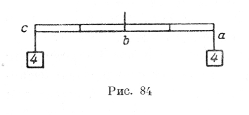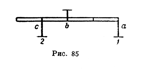 "Пусть с (рис. 84) будет данным весом, к которому я хочу на противоположном плече аb найти противовес. Я множу плечо ab столько раз на величину данного веса, равного 4, сколько раз в нем помещается противоположное плечо bс. А так как в данном случае плечи весов равны, то ты скажешь, что плечо противовеса аb содержит данный вес с, равный 4, один только раз, так как один только раз в плече ab помещается противоположное плечо bс, почему на полученное произведение 4 в а ты разделишь вес 4 в с и получишь 1. Эту единицу помножь на данный вес, произведение дает 4, каковое 4, помещенное в а, будет истинным противовесом 4 в с, так как равные веса, помещенные на равных плечах, сопротивляются опусканию одно другого. "Помножь плечо аb (рис. 85), поддерживающее противовес а, столько раз на данный вес с, равный 2, сколько раз в нем помещается противоположное плечо bc, равное 1. В аb, равном 2, плечо bc, равное 1, помещается два раза. На полученное произведение, равное 4, раздели данный вес с, равный 2, и получишь ? . И эту половину опять умножь на данный вес с, равный 2, так что произведение будет 2/2, т. е. целая единица, каковая, будучи помещена в а, дает истинный противовес данному весу с.
