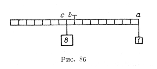 "По тому же правилу ты скажешь (рис. 86): 8 ab на 8 с (ибо плечо аb помещает в себе 8 раз плечо bc) дает 64. Раздели это 8 с на 64, получится 8/64, и это число помножь опять на эти 8, получится 64/64, т.е. целая единица, каковая, будучи помещена в а, сопротивляется 8-ми. "Докажи, почему этот способ (ragione) хорош. Ты увидишь, что здесь умножение плеча аb на вес с делается столько раз (на вес с?), сколько раз плечо bc помещается в аb, и получается, что образует 64 в а, а 64 так же относится к 8, как 8 к 1. Теперь, для того чтобы 64 превратить в 1. тебе необходимо разделить 8 на 64, что дает 8/64, то есть 1/8, а для того, чтобы эта восьмая превратилась в целое число, помножь эту 1/8 на 8 с и получишь 8/8, т. е. целую единицу, и будет хорошо (е sta bene)" (С. А. 36" r. А и v. 1).). Шустер в современных алгебраических выражениях, конечно абсолютно чуждых Леонардо, формулирует все вышеизложенное, а Марколонго изображает последовательные действия, производимые во всех приведенных примерах, что и в том и в другом изображении дает в конечном расчете правильное решение.