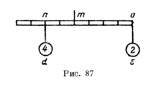 В этом необычайно сложном рассуждении относительно крайне простого соотношения видны не только отмеченные уже выше неопытность и неловкость, смутное представление о рассматриваемом предмете, но и заведомое желание запутать читателя или, кернер, слушателя, подводя его после долгих математических выкладок к правильному решению. Вспомним, что Леонардо вообще не чужда была любовь к позированию, что, невидимому, проявляется и в данном случае. Не оставались; вне всякого сомнения, без влияния на данную аргументацию и сложные алгебраических выкладки доказательств "Книги Карастуна" Невидимому как раз в это время изучавшейся Леонардо. Но чем бы ни объяснялись явные недостатки приведенного выше способа, прав Марколонго, который, полемизируя с Шустером, подчеркивает, что в этом способе мы имеем только раннюю стадию леопардовых знаний. Позднее, уже во второе флорентийское пребывание, Леонардо нашел значительно более простой способ решения той же задачи. Действительно, как раз на первой странице "Кодекса Арундель", в котором Леонардо в 1508 г. предполагал, очевидно, изложить основы механики, хотя еще не в окончательном порядке, но все же в некоем предварительном тематическом подборе, он дает в следующих выражениях основу основ механики — задачу на нахождение груза на противорычаге при известных плечах и грузе на рычаге: "Помножь деления плеча рычага на фунты подвешенного к нему груза и произведение раздели на деления противорычага частное будет равно противовесу, который, будучи подвешен на противорычаге, сопротивляется опусканию груза на рычаге. "Например: 2 nт помножь на вес d, что дает 8, раздели их на 4 то, получается 2, и это 2 есть противовес, который, будучи помещен в ое, сопротивляется опусканию 4, помещенных в nd (рис. 87).