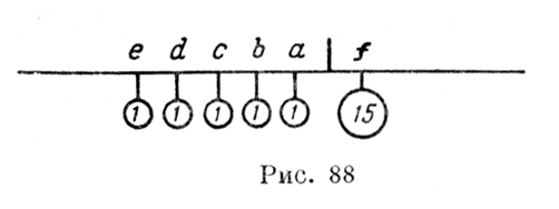 "И, обратно, можно сказать: "Дважды четыре=8; раздели на 2 тn, получишь 4, итак, ты имеешь 4 для веса d, и это правило всегда подтверждается. "Помножь большое плечо весов на вес, поддерживаемый им, и произведение раздели на меньшее плечо, частное будет вес, который, будучи помещен на меньшем плече, сопротивляется опусканию большего плеча, если раньше плечи весов были освобождены" (Аr. 1 r. и v.). В последней записи действительно и неоспоримо мы имеем вполне четкое и простое решение задачи, оперирующее к тому же с произведением веса на плечо, т. е. с понятием момента силы. Однако это понятие применяется только как вспомогательное промежуточное звено и не выдвигается в качестве величины, определяющей равновесие рычага. Наталкиваясь на понятие момента силы, Леонардо, очевидно, не дошел до помещения его в центр теории рычага. Дав рецепт для разрешения первой и простейшей задачи на закон рычага, Леонардо в дальнейшем усложняет его. Так, на листе 100 v. ab. "Атлантического кодекса" он пытается определить, на каких местах плеч весов надлежит расположить три данных груза, из которых больший и меньший помещены на одном плече, а средний на другом; чтобы весы были в равновесии. Рассуждение это, не законченное и в достаточной степени запутанное, сначала устанавливает длины плеч, на которых укреплены больший и средний грузы; последние он принимает по числу единиц длины равными разности между средним и меньшим — и большим и меньшим грузами. Этот прием напоминает применявшееся Альберти приравнение числа единиц длины плеч рычага к числу единиц веса грузов. Дальше, желая определить плечо меньшего груза, он запутывается и решения не дает. Возможно, что данная или подобная ей задача подводит Леонардо к более простому вопросу — определению противовеса, сопротивляющегося на данном рычаге нескольким данным весам, расположенным, опять-таки, на данных противорычагах. Уже в одной из наиболее ранних своих механических записей, на пятой странице кодекса "А", он пишет (рис. 88):