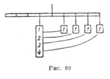 "О весе. "Спрашиваю: если два рычага будут разделены на равные части и в а, b, с, d, е будет подвешен в каждой один фунт, сколько фунтов будут их уравновешивать в f? Сделай так: a уравновешивает один фунт, подвешенный в f, b уравновешивает 2, с — 3, d — 4 и е — 5, а вся сумма уравновешивает 15 фунтов, подвешенных в f" (А. 5 r.). Простая, сравнительно, задача разрешается простым способом, без всякого теоретизирования и особых рассуждений. Обратную задачу уравновешения данного груза, помещенного на одном плече, несколькими равными грузами, помещенными на равных расстояниях на другом плече, так же просто и лаконично, даже без словесного объяснения, а просто чертежом, Разъясняет значительно более поздняя запись "Кодекса Арундель", гласящая: "Раздели данный вес на пропорцию плеч и замени потом эти веса на эти плечи" (Аr. 227 v.) (рис. 89). Значительно более трудной представляется Леонардо задача, как бы составленная из двух вышеприведенных. Полная формулировка этой задачи отнюдь не представляется ясной, но по-видимому, она сводится к следующему: даны три неравных груза, расположенных на равных расстояниях на одном плече весов; требуется найти три других груза, не равных первым расположенных на тех же трех равных расстояниях другого плеча весов, так чтобы весы остались в равновесии, и определить, какой вес в каждом из искомых грузов уравновешивает каждый из грузов данных. Решение, даваемое Леонардо этой довольно замысловатой, но, возможно, связанной с какой-нибудь конкретнейшей технической потребностью задаче, достаточно длинно, но настолько показательно для его научного метода, что мы приведем его полностью:
