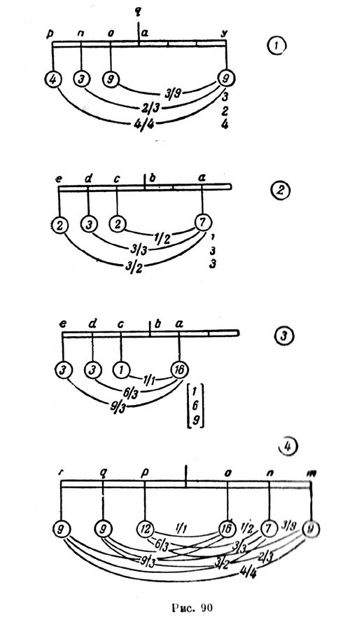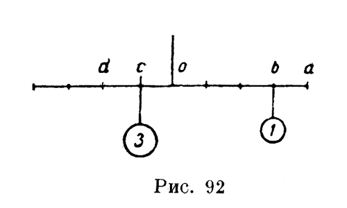 "Это правило показывает, каким образом ты можешь на плечо равноплечих весов поместить много грузов, противоположных один другому, и узнать о каждом грузе отдельно, какая часть противоположна ему в каждом из противолежащих грузов, уравновешивающих его, причем можно сделать это в дробях против дробей и в целых числах против целых чисел. "Здесь (рис. 90, фиг. 1), так как расстояние оа содержится три раза в ау, 3 в у будет уравновешивать 9, и так как an содержится 1 ? раза в ау, т. е. an есть 2/3 у, 2 в у будет уравновешивать 3 в n, и так как расстояние ар содержится один раз в уа, то 4 в у будет также уравновешивать 4 в р. Теперь собери вместе числа в у, т. е. 3, 2 и 4, что дает 9, и помести его в круге, привешенном в у. "Здесь (фиг. 2), так как bс есть ? расстояния ab, вес, противоположный ему в с, будет половиной веса а, и так как расстояния ab и bd равны, веса их также будут равны. И так как расстояние ab равно 2/3 be, вес в е будет 2/3 веса в а. Собери числа, сумма которых дает 7, и помести их в круг а.
