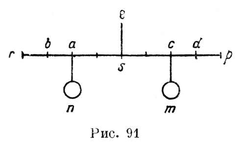 "О весах. Если отодвинуть (рис. 91) равные веса на равные расстояния от центра или оси весов, то они будут сохранять концы весов равноотстоящими от опоры их, т. е. если веса m, n, подвешенные в с, а, будут иметь равный вес и находиться на равном расстоянии от оси весов s и если ты их отдалишь от этой оси вплоть до d, b, то, если эти расстояния будут равны, концы весов р, r, останутся на равном расстоянии от /. "О весах. Если неравные веса поместить на неравных расстояниях весов и последние при этом останутся горизонтальными, затем же отодвинуть их на равные расстояния, то весы наклоняются в сторону большего веса, т. е. если вес b (рис. 92) весит один фунт и уравновешивается тремя фунтами в с, то причина этому та, что b отстоит на 3 унции, а с отстоит от оси на 1 унцию, и необходимо дополнить их так, чтобы вес части, имеющие между собой ось, были количественно (dj numero) равны, т. е. если с есть 4—3 фунта веса и 1 деление, что дает 4, то таким же образом b будет иметь 3 деления и 1 фунт, что дает 4, и, следовательно, имея в фунтах и делениях по 4 на каждой стороне, весы будут горизонтальными. "Если же теперь хочешь отдалить оба веса одинаковым образом от их места, то больший вес будет тянуть плечо весов вниз; причина же этого та, что если ты перемещаешь b в а и также с в d, то расстояние от оси до веса выходит из прежней пропорции, ибо со помещалось раньше три раза в оb, а после перемещения грузов в а и d, do помещается 2 раза в оа, а не 3, как раньше, и для того чтобы уравнять эти весы, необходимо было бы, чтобы вес 3 сделался равным 2, что было бы хорошо; если же нет — 3 опускается" (А. 42 v.). В этом, повторяем, весьма раннем отрывке наблюдается серьезная путаница. Вначале Леонардо явно следует за данным Альберти рецептом сложения весов с делениями плеч, рецептом, как мы отмечали, правильным только при условии равенства суммы единиц веса в обоих грузах и суммы единиц делений на обоих плечах, условии, выдержанном и в примере Леонардо; затем же он раздвигает грузы, вследствие чего условие нарушается и правило сумм оказывается неприменимым. Тогда Леонардо бездоказательно, по но существу правильно утверждает, что при удалении на равные расстояния должно быть сохранено между этими весами отношение, равное отношению новых расстояний; при несоблюдении этого более тяжелый груз опустится. На примере этой записи мы можем ясно проследить разницу между творчеством в области механики Леонардо и Альберти. В то время как Альберти, выставляя свое правило сумм, подкрепляет его одним частным примером и на этом успокаивается, Леонардо, перенимая у Альберти это правило, начинает экспериментировать над объектами, подчиняющимися ему. Отодвигая и придвигая грузы, он невольно обнаруживает недостаточность, вернее непригодность этого правила. Так, реальный, ощупываемый руками опыт, будучи введен в систему механики в качестве органической и основной ее составной части, начинает свою плодотворную работу по отсеву правильных теорий от хотя бы логически убедительных и стройных, но неправильных, — работу, которой столь недоставало механике схоластической.