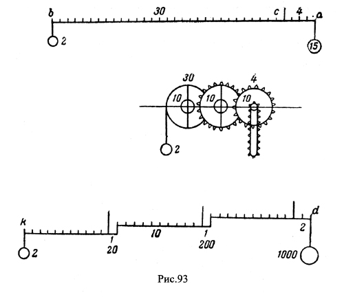 Одной из наиболее сложных частных задач на теорию рычага, разрешаемых Леонардо, является задача о разнице между непрерывным и прерывным рычагом. Вопрос этот поднимается в нескольких записях. Наиболее ранняя и, пожалуй, наиболее интересная запись, посвященная этому вопросу, гласит: "Какая разница между непрерывным и прерывным рычагом? "Я намерен здесь (рис. 93) кратко показать разницу между прерывным и непрерывным рычагом. Предположим, что рычаг ab изображенный вверху, будет непрерывным рычагом, нижний же рычаг dk будет прерывным рычагом, который представляет собой результат изображенных выше трех колес. Итак, ты имеешь в непрерывном рычаге 30 рычага против 4 противорычага и то же имеешь в прерывном рычаге, и находишь, что в непрерывном рычаге два фунта находятся в равновесии с 15, которые привешены в конце противорычага, и, кроме того, находишь, что в прерывном рычаге те же два фунта находятся в равновесии с 1000, причем и тот и другой рычаги имеют 30 рычага против 4 противорычага. Теперь ты можешь узнать разницу, а именно, что одна более сильна, чем другая, в 66 раз и 10/15 и делает ее в 66 раз и 10/15 более медленной, и это соответствует законам природы, почему не может быть избегнуто (е questo e in nelle regole di natura, onde non si po scifare)" (C. A. 153 v. d.). Примерно, то же изложено в поздней записи "Кодекса Арундель":