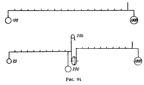 "Если верхняя линия (рис. 94) будет иметь один локоть противорычага, то знай, что если ты привесишь и концу этого противорычага 1800 фунтов, а в конце рычага поместить 100 фунтов, то рычаг и противорычаг будут находиться в равновесии. "Если же эта линия будет разделена на две равные части я первая будет иметь 1 противорычага и 9 рычага, то это дает 200 рычага, поднимающие на противорычаге 1800. Таким образом, вторая половина линии будет иметь на противорычаге только 200. Имея же один локоть в противорычаге и 8 в рычаге знай, что 25 будет находиться в равновесии с 200. "И это утверждение кажется вещью удивительной, так как верхняя линия имеет 18 рычага против одного, а нижняя разделена на 2 противорычага и 17 рычага, причем 1800 будут подняты приблизительно 200 фунтами, и опыт показывает, что 25 исполняют работу 200" (Аr. 265 r.). В приведенных двух записях мы видим, с одной стороны, выражение изумления по поводу явления, кажущегося невероятным при поверхностном подходе к нему; с другой же — в них, особенно в первой, с исключительной яркостью проступает практический, экспериментальный, подчиненный интересам техники подход Леонардо к задачам теории рычага; подход, который мы неоднократно выдвигали как наиболее характерную черту его научного творчества. |