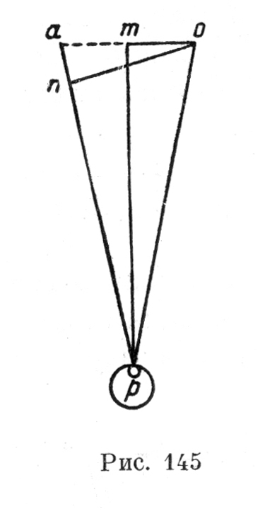 В противоположность более раннему утверждению Леонардо, как бы ни был мал угол, образуемый нитью, ветви ее всегда испытывают натяжение больше половины веса; этот избыток будет относиться к подвешенному грузу. Если же допустить, что в текст Леонардо вкралась описка (их число в рукописях Леонардо значительно) и что он имел в виду отношение этой прибавки к весу P/2, а не к весу Р. Подставляя из прямоугольного треугольника, получим oa—оn=оа—on. Это показывает, что утверждение Леонардо верно в этой своей части. Правильность последнего утверждения показывает, что Леонардо, придя через ряд заблуждений и ошибок к решению долго занимавшей его задачи, уже может при помощи его решать задачи более конкретные. В частности, он лает правильное объяснение явлению, отмеченному, как мы помним, уже в ранних записях (см. стр. 655), что никакими сколь угодно большими грузами на концах нити нельзя выпрямить ее, если она прогнута грузом, подвешенным в середине... Лист 6 v., в котором доказывается это утверждение, как бы суммирует все вышесказанное. Он гласит: "Рычаг и потенциальный противорычаг (измерители веса, поддерживаемого углом нити) никогда не будут вдвое больше один другого, так как, находясь в положении, при котором один вдвое больше другого, они немедленно уничтожаются, и здесь кончается сообщество естественного веса с приобретаемым вместе с наименьшим углом из всех острых. "Если бы было возможно выпрямить нить, растянутую поперек, и уничтожить последний, наибольший из тупых углов, создаваемых весом, поддерживаемым в середине этой нити, тогда сила (р) этой нити была бы бесконечной при поддержке малого веса и рычаг и противорычаг уничтожились бы, что невозможно, так как при таком положении нити ни одной силы нет без рычага. "Заключение о весе, подвешенном в углу нити, и как он распределяется на каждую сторону этого угла. "Невозможно, чтобы когда-либо под действием любой силы (p) нить, растянутая поперек, могла выпрямиться, и это тем более невозможно, если она будет иметь какой-нибудь вес. Подвешенный в середине ее длины (рис. 146). "Доказательство. Пусть dnb — нить, растянута поперек, и е — вес, привешенный к ней. Здесь по 7-й "о равновесии" я построю потенциальный рычаг, плечами какового будут bа и bc и cd и ае — его полуреальные подвесы. Итак, я говорю, что для выпрямления нити dnb ее угол должен постоянно увеличиться и рычаг bc уменьшаться, а противорычаг bа увеличиваться. И так как этот рычаг делим до бесконечности, то необходимо было бы бесконечно увеличивать вес, для того чтобы уменьшить рычаг, каковой вес пришлось бы бесконечно увели- чивать, если бы нить и его подвесы не порвались" (Аr. 6 v.).