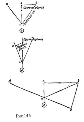 "Обе эти фигуры есть одна и та же, но она рассчитана два раза, чтобы не запутывать глаз и один раз рассчитана с одной стороны и другой раз — с другой" (Аr. 7 v.). Нетрудно понять, что Леонардо рассматривает каждую сторону отдельно; пользуясь установленным им раньше правилом, он находит, что натяжение ветвей нити так относится к весу груза, как длины перпендикуляров из точки подвеса противоположной ветви на вертикаль относятся к длине перпендикуляров из той же точки на направление данной ветви, т. е. (фиг.1), что совершенно правильно дальше иллюстрируется на следующем примере. "Здесь (рис. 148) вес n поддержан двумя различными силами, т.е. mf и тb. Теперь мне нужно найти рычаг и потенциальный противорычаг этих двух сил bm и fm, из которых силе b будет дан рычаг fe и противорычаг fa. Рычагу fc будет дан подвес еb, к которому приложен двигатель b, и к противорычагу fa дан подвес an, поддерживающий вес n. Устроив равновесие между силой (p) и сопротивлением двигателя и веса, надлежит посмотреть, каково отношение между рычагом fe и противорычагом fa, каковое fa составляет 21/22 противорычага fe. Следовательно, b чувствует 22, если вес n будет 21. Следует второе расположение рычага и противорычага be и bа, с которым соединен подвес eb, соединяющийся с двигателем f, и подвес an, соединяющийся с весом n. Теперь нужно посмотреть, каково отношение между bс — рычагом и ba — противорычагом. Противорычаг составляет треть рычага. Следовательно, один фунт силы в f сопротивляется трем веса в ba, и 21/22 трех фунтов в n, помещенные в b, сопротивляются 22-м, помещенным в ba. "Окончено правило расчета неравных плеч нити, расположенных под углом" (Аr. 7 v.). Последняя фраза создает впечатление, что задача окончательно разрешена, правило расчета плеч найдено и можно переходить к следующим вопросам. Но достаточно перевернуть два листа того же "Кодекса Арундель", и оказывается, что это далеко не так. С одной стороны, предложенное правило было, очевидно, слишком сложным и замысловатым для Леонардо-тех- ника; с другой же, мы не должны забывать, что имеем дело с автором "Тайной вечери" и "Джиоконды", творцом, никогда не довольным своим произведением и всегда стремящимся до- стигнуть еще лучшего. Действительно, начиная с листа 9 r., Леонардо, уже стоя на твердой почве полученных им результатов, приступает к разработке нового способа подсчета натяжений нити. "Здесь доказывается, почему в таком отношении находятся части веса, подвешенного в углу между двумя сторонами треугольника, которые чувствуют 2 эти стороны, в каком находится одна из этих сторон со своей высотой (рис. 149). Причина того, почему стороны воздействуют так, что их высоты испытывают влияние веса, привешенного к углу таким образом, что линия fc равна этой стороне по определению окружности. И так же можно было сказать, что таково отношение между частью be и всем ас, каково оно между весом, укрепленным в углу, в котором сходятся эти стороны...