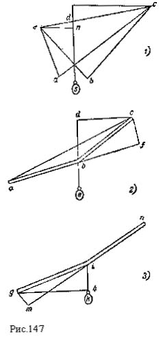 Сначала Леонардо подходит к вопросу очень осторожно, расчленяя его на две части, а затем на конкретном примере иллюстрирует получаемое им общее правило. "Здесь (рис. 147) имеется двое весов и одни из них имеют плечи cf и cb, плечи других — еn и еа (фиг. 1), abc — нить, образующая угол (фиг. 2), е — вес, поддерживаемый этой нитью cd — плечо весов, поддерживающее вес е, cf — противоположное плечо весов, где находится двигатель этого веса т. е. а. "nig — наклонная нить, поддерживающая в углу i (фиr. 3) вес k; gi — плечо весов, поддерживающее вес h, gm - второе плечо весов, где находится сопротивление веса k, т. е. n.
