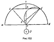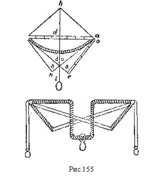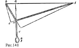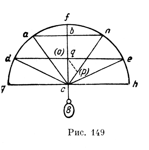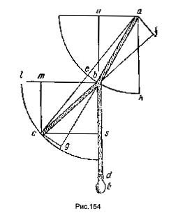 "Здесь (рис. 154) по пятой 7-го вес, приходящийся на нить аb, уменьшается на половину своего веса, как доказывает линия hb на расстоянии ai. Из этого следует, что вес 6 превращается в 3 в b, и так как рычаг af есть 3/5 своего противорычага, из этого следует обратная пропорция, т. е. что вес b, привешенный к противорычагу nа, превращается в 3 и вес рычага делается в 5 в f. Следовательно, 6 главного веса d чувствуется нитью cb как 5. "Тяжесть 6 в d, которая по положению