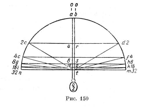 "Пусть подвешенная под углом нить (рис. 150) будет ctd и высота ее угла будет rt, которая кончается в угле, в котором подвешен вес о. "Вес о, бывший 2 для нитей, бивших равными своей высоте at и bt. При уменьшении этой высоты или перпендикуляра на половину длины, когда концы нитей опустились в с и d, высота находится в rt — половине at, тогда вес 2, бывший в ab, делается 4 в cd и так далее, деля эту высоту последовательно пополам каковое деление дает бесконечное уменьшение высоты, и, следовательно, оно должно было бы вызывать бесконечное умножение веса для сторон этой высоты" (Аr. 9 v.). На следующей странице рассматривается более общий и сложный случай, когда высота не делится пополам: "Груз, подвешенный в середине горизонтальной нити, образующей над собой угол. Пусть будет проведена прямая линия, своими концами упирающаяся в точку укрепления этой нити; итак, ты образуешь треугольник, высота которого будет находиться в таком отношении со своей стороной, в какой находится средний вес с весом, который чувствует точка укрепления этой нити. "Так как высота fD (рис. 151) треугольника