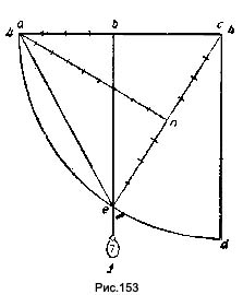"Здесь (рис. 153) высота be есть 7 и сторона се есть 8. Следовательно, вес высоты, равный 7-ми, чувствуется как 8 своими двумя сторонами, из которых 4 приходится на каждую сторону. Следует второе доказательство. tab — противорычаг есть 4/7 an - рычага. Следовательно, 4 сопротивления в n противодействует 7 опускания в b. И вот второе доказательство подтверждает верность первого, т. е. каждое из доказательств показывает, что сторона ее чувствует 4 в с из 7 поддерживаемых углом соединения обеих сторон ae и се. ´"В этом расположении нитей 7 (единиц) веса, помещенные в е, рождают единицу приобретаемого веса в двух сторонах" (Аr. 11 r.). И эта запись, как предыдущая, показывает, что более простой способ дает численно такой же результат, как способ более сложный. Следовательно, если на нескольких примерах доказана идентичность результатов, получаемых обоими способами (а правильность результатов первого, более сложного опыта доказана), то, значит, и более простой способ будет давать всегда правильные результаты. Добившись полного усвоения способа определения натяжения нити с грузом, образующей равные углы с вертикалью, Леонардо не останавливается и на этом, а пытается применить тот же способ и для значительно более сложного случая неравных углов.