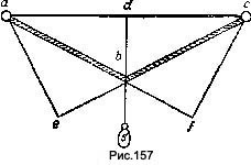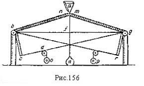 "Я хочу знать, какую свою часть отдает весомое тело своим опорам, т. е. mg и nb (рис. 156). Я построю два потенциальных рычага bс и gr, которые будут находиться в прямоугольном, соединении с bn и mg в точках b и g. Затем проведу прямую bg из b в g и в середине ее опущу перпендикуляр fn из-под центра весомого тела а и, таким образом, получу прямой угол bfn в точке f. Кроме этого, проведу подвес cd, под прямым углом соединяющийся с рычагом be, и так получу рычаг be с подвесом cd против потенциального противорычага bf с его подвесом fn. Если же противник утверждал бы, что этот противорычаг не потенциален, но реален, т. е. противорычаг bn, то ему можно ответить при помощи 10-й этой работы, где говорится, что все подвесы, направленные к центру мира, соединяются под прямым углом и плечами весов, находящихся в положении равновесия, и по вышеприведенному первому положению, что всякое соединение между подвесом и плечом рычага прямоугольно, что не может быть осуществлено, если по утверждению противника n будет соединено с подвесом fn. А, следовательно, прямой угол bfn соответствует нашему требованию и т. д. "Здесь подсчитываются математические силы (р), а не реальные веса, т. е. веса членов механизмов (membre de li strumenti). "Подсчет. В той же пропорции, в которой находится •потенциальный рычаг be с реальным противорычагом bf, будет находиться и сила угла с сопротивлением угла. Следовательно, так как силы обратны, то be, будучи вдвое меньше bn, будет иметь двойную силу для поддержания bn.