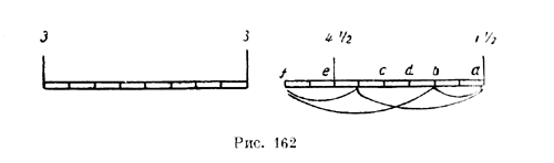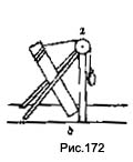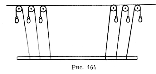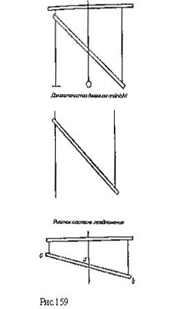 "Если 2 человека несут балку наверх по лестнице и если дерево этой балки имеет равномерную толщину и вес, то точно столько же будет чувствовать его вес тот, который поддерживает его вес внизу, как тот, кто поддерживает его наверху, и если все бревно стремится упасть к центру, то все части его имеют то же самое стремление и, стремясь падать вертикально (a piombo), дают вышеприведенный результат (А. 52 v.) (рис. 158). Таким образом, Леонардо дает сразу же совершенно точный и правильный ответ на свой вопрос: балка, подвешенная наклонно на двух параллельных нитях, равно нагружает обе эти нити. Вполне четко формулирует Леонардо это утверждение в несомненно ранней записи "Атлантического кодекса", где он дает его без доказательства: "Та балка, которая будет укреплена за свои концы и будет подвешена на нитях разной длины, будет всегда отдавать равную часть своего веса каждой из двух нитей, если они падают перпендикулярно к месту, в котором они привязаны" (С. А. 273 r. а.).