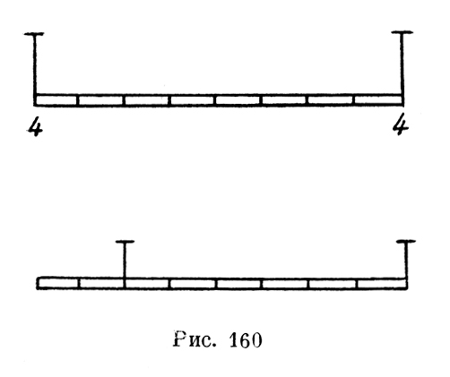 Из рисунка, сопровождающего запись, видно, что Леонардо, как обычно, пришел к своему утверждению через эксперимент, техника которого видна из также ранней записи кодекса "С": "При подвешивании тела длинной формы, равномерной толщины и веса за свои концы на двух нитях, укрепленных на концах равных плеч весов, весы останутся в горизонтальном положении, несмотря на разную длину нитей. Причина этого тa, что если ты проведешь вертикально линию, проходящую под центром весов, то эта линия пройдет также через центр Одержанного веса" (С. 7 v.) (рис. 159). При подвесе балки за концы вопрос разрешается, таким образом, совершенно легко. Но тогда, естественно, возникает и следующий вопрос: как будет распределяться нагрузка, если одна из нитей сдвинется от конца, который останется торчать в воздухе? К этому вопросу Леонардо многократно возвращался в записях "Атлантического кодекса". Одна из наиболее простых и, по-видимому, ранних из них гласит:"Если 2 нити поддерживают стержень за его два конца (рис. 160), то его вес равномерно распределяется между этими нитями.