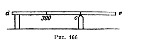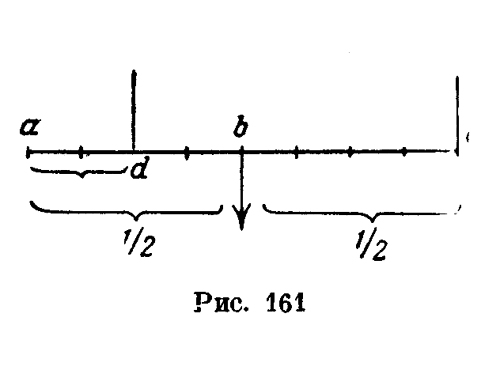 Не вполне ясное утверждение Леонардо в приведенном отрывке оказывается вполне правильным, если мы под словами "вес, остающийся на противоположном конце", будем понимать, как это делает Шустер, груз, который раньше выдерживала данная нить. Тогда, обозначив (рис. 161) весь вес балки через Р всю длину ее через /, длину передвижения левого подвеса через а, а натяжение неподвижной нити после передвижения подвижной через х, получим формулу Леонардо. Это вполне правильно, так как задача сводится к разложению силы. Р на две параллельные составляющие и есть утверждение Леонардо, в чем легко можно убедиться. К этой же формуле Леонардо возвращается и в ряде других записей; одна из них дает числовой пример и, до некоторой степени, вскрывает ход его мыслей. "Между весом, который отделяется от неподвижной нити, и весом, который она раньше выдерживала (где он приложен), будет такое отношение, как между частью стержня, выступающей за одну из нитей, и остатком его, заключенным между 2 нитями.
