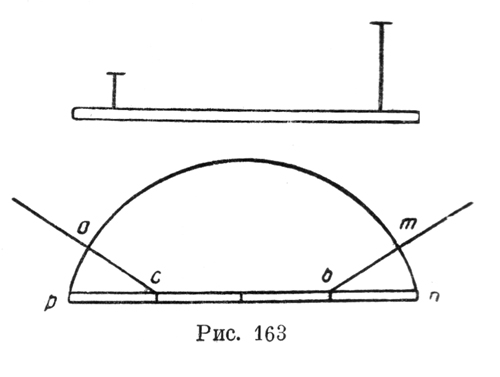 "То, что выше высказано, легко может быть доказано (рис. 162), так как если ты посмотришь в опыте, приведенном выше, на стержень, выступающий за одну из нитей, то ты найдешь, что он помещается 2 раза в длине стержня, заключающейся между 2 нитями, и так же обстоит с весом, отделяющимся от крайней нити и присоединяющимся к весу движимой нити, так как, когда 2 нити были привязаны на концах стержня в 6 фунтов, то каждая из них выдерживала 3 фунта. Когда же затем одна из нитей передвигается к середине, то ты видишь, что та, которая остается неподвижной, в конце стержня разгружается от половины своего прежнего веса, так как если она вначале выдерживала 3 фунта, то теперь она выдерживает только 1 ?, что составляет 3. И кажется, что природа в этом случае применяет равные движения, так как если движение, производимое нитью от конца стержня к середине, помещается, как видишь, 2 раза в остатке этого стержня, то также и вес неподвижной нити, укрепленной на противоположном конце стержня, прибавляется к весу нити, движущейся к середине стержня, в помещается 2 раза в весе, ранее поддерживаемом ею" (С. А. 101 r.а). Запись эта, во-первых, делает совершенно бесспорным приведенное выше толкование формулы, даваемой Леонардо; во-вторых, она показывает, что к довольно сложному и искусственному выражению этой формулы Леонардо пришел отнюдь не через освоение закона разложения силы на составляющие, как утверждает Марколонго, а чисто экспериментально. Он, несомненно, подвешивал каждую нить к отдельным весам и следил за изменением веса при передвижении левой нити. Затем, получив ряд значений, он подобрал формулу вида пропорции, связывающей эти значения, — отсюда и искусственность выражения формулы, отсюда и ее правильность. Полученную и рассмотренную выше формулу Леонардо записывает еще в ряде мест (С. А. 101 r. а., 152 v. b., 345 v. а. и др.). Но на ней не заканчиваются его исследования распределения веса подвешенного стержня, — он ставит перед собой еще один вопрос: как передается вес стержня непараллельным подвесам? Первоначально Леонардо как будто склонен считать, что направление подвеса не играет роли. Так, в одной из ранних записей "Атлантического кодекса" он пишет: "Эта балка, будучи поддержана равными углами, будет равно поддержана каждой нитью, и хотя одна нить длиннее другой, одна выдерживает такой же вес, как и другая. "Равные углы, которые образуют линии нитей, поддерживающих балки, с линией балки, этими нитями поддерживаемой, поддерживают в этой балке равный вес (рис. 163). "Наклонная сила производит то же самое действие в весах, что и перпендикулярная; испытано это в форме, указанной ниже, на натягиваемой медной проволоке" (С. А. 253 r. b).