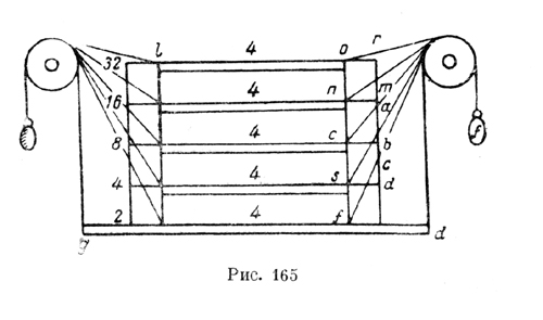 "Здесь (рис. 164), потому что углы, образуемые нитями с балкой, равны между собой, каждая нить будет поддерживать равную часть веса балки, хотя бы они были подвешены на раз- ных высотах" (С. А. 268 r. а.). Чертеж, сопровождающий запись, ясно показывает, как Леонардо пришел к этому правильному, но далеко не достаточному результату. Для того же, чтобы подойти к определению изменения нагрузки стержня при изменении угла, образуемого нитью с балкой, Леонардо рассуждает так: "Вес, т. е. балка. Там, где нить, на которой она подвешена, будет отходить от этой балки под прямыми углами, там эти нити никогда не будут иметь больше веса, чем вес поддержи- ваемой ими балки. "А когда нити будут отходить от подвешенной на них балки под более острыми углами, тогда они будут поддерживать тем больший вес по сравнению с весом балки, чем острые углы, образованные направлением балки и направлением нити, будут меньше прямых углов (рис. 165).