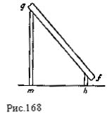 "Пятнадцатое предложение о весе (рис. 167). Опора будет иметь на себе тем меньше веса по сравнению с другой, чем более удалена она будет от центра этого веса — одна по сравнению с другой и (общий вес делается) меньше на вес, выступающий за вторую опору (текст не ясен и восполнен нами). "Примем, что более удаленная опора будет b, более близкая — а, центр же вышеназванного веса будет k; тогда я утверждаю, что если вес, помещенный на двух опорах, будет равен 8 фунтам, то b будет поддерживать 1, а а — 5. Тут ты мне мог бы сказать, что нехватает 2 для того, чтобы получить вышеназванные 8 фунтов, на что можно ответить и доказать, что на опорах а, b находятся 6 фунтов, из которых 3 приходится на опору a и 3 на b, a 2, а именно sr, выступающие .за опорой а наружу, служат противовесом той части, которая находится между а а и b каковая облегчается на 2 фунта" (С. А. 316 v. b.). Решение, даваемое здесь Леонардо, совершенно ошибочно. Он здесь имеет дело с тем же разложением веса тела на две параллельные составляющие, как и в случае подвеса балки, для которого он дал правильный ответ. Но он почему-то не замечает идентичности обоих случаев и, не имея возможности экспериментально определить величину давления на опору, предается неубедительным и противоречивым рассуждениям, приводящим его к неправильному результату. Эта ошибка Леонардо, которую он, может быть, где-нибудь позднее исправил (нам такие исправления найти не удалось), вскрывает сильные и слабые стороны его метода не хуже его успехов. В тех случаях, когда он мог в ряде экспериментов более или менее точно измерить при разных условиях величины, связанность которых между собой он стремится определить, он через ряд ошибок, неправильных и неудачных формулировок всегда добивался правильных результатов. Там же, где хотя бы одна из этих величин не поддается точному измерению, он оказывается совершенно беспомощным. Леонардо в первую очередь экспериментатор, а не математик-теоретик. Подтверждение этому мы находим и во второй решаемой Леонардо задаче на подпертую балку, косо стоящую на земле. Вопрос о косо стоящей балке (но на двух опорах) возник (как уже выше сказано) перед Леонардо еще в начале его научной Деятельности. Так, в кодексе "А" он ставит перед собой следующий, не получающий ответа вопрос: "Если брус fg (рис. 168) будет весить 200 фунтов, то какую часть веса будет нести h и какую m?" (А. 2 v.).