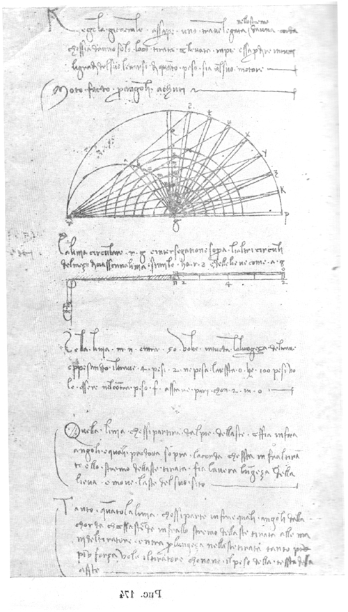 В этой записи мы видим отражение реального опыта, произведенного Леонардо. Ввиду того, что в равновесии устанавливалась, очевидно, балка значительных размеров, оказалось неудобным прикреплять к ней нить под прямым углом. Поэтому он прикрепляет ее под острым углом, в данном эксперименте равным 30°. Установив так балку и исходя из своей теории других кругах половины каждой из линий подобных rs и рычага как ag.