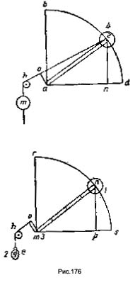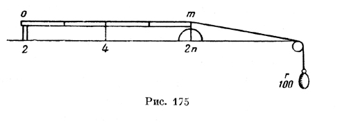 "Хотя нити ms и mf (рис. 171) укреплены в т, но, несмотря на это, действуют (fanno forza) так же, как если бы они были укреплены в рычаге такой длины, которая была бы (равна) прямой, соединяющей (их направление) с центром под равными углами. "Я спрашиваю, сколько веса в а и сколько в b" (С. А. 75) Запись эта, носящая чисто черновой, предварительный характер, служит как бы подготовкой к несравненно более отделанной записи другого листа того же кодекса, подробно разбирающего тот же вопрос. Запись эта гласит: "Так следует взвешивать вне прямых углов, т. е. линия нити в линия балки должны быть устроены таким образом (рис. 173):
