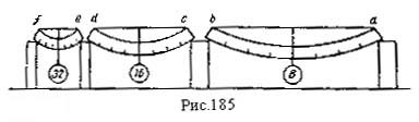 Таким образом, в результате своих экспериментов, под которые он в данном случае даже и не пытается подвести какую бы то ни было теоретическую базу, Леонардо приходит к следующей формуле: сопротивление х, где h — сторона сечения балки, а I — длина ее. Формула эта неправильна, так как правильная формула дает х. Но в то же время, так же как и формула сопротивления вертикальных опор, она замечательна и как первая в своем роде, и как правильно в общем схватывающая основной характер зависимости, точно вывести которую не позволяла Леонардо его недостаточная экспериментальная техника. С приведенной выше записью, насколько нас известно, единственной в своем роде в научном наследии Леонардо, тесно связана другая запись того же "Атлантического кодекса" — по вопросу о прогибе балки, лежащей на двух опорах и нагруженной в середине определенным грузом. Возможно, что именно от определения прогибов Леонардо думал перейти к более точному определению сопротивления балок, лежащих на двух опорах. Определение прогиба Леонардо, конечно, производит на эксперименте, который он описывает следующим образом: "Опыты с железными нитями и пластинками (sperienze con fili di ferro e maglietti). Если ab (рис. 185) под влиянием веса 8 сгибается на 1/8 своей длины, то cd, если она будет, как я полагаю, двойной силы (fortezza) по сравнению с ab, не будет сгибаться на 1/8 своей длины под влиянием веса меньшего 16, ибо она имеет длину вдвое меньше, чем ab, и также ef не будет опускаться на 1/8 своей длины под влиянием веса в 32.